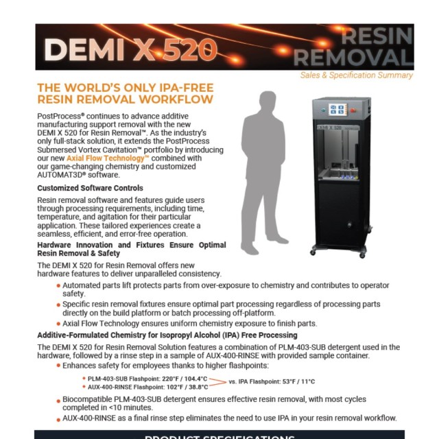 PostProcess® introduceert de DEMI X 520 voor harsverwijdering, waardoor de verwijdering van overtollig hars bij additieve productie verder wordt bevorderd. Deze complete oplossing breidt het PostProcess SVC-portfolio (Submersed Vortex Cavitation™) uit met nieuwe Axial Flow Technology™, innovatieve chemie en aangepaste AUTOMAT3D®-software die de gebruiker door verwerkingsvereisten zoals tijd, temperatuur en roering leidt, specifiek afgestemd op hun toepassingsleads.